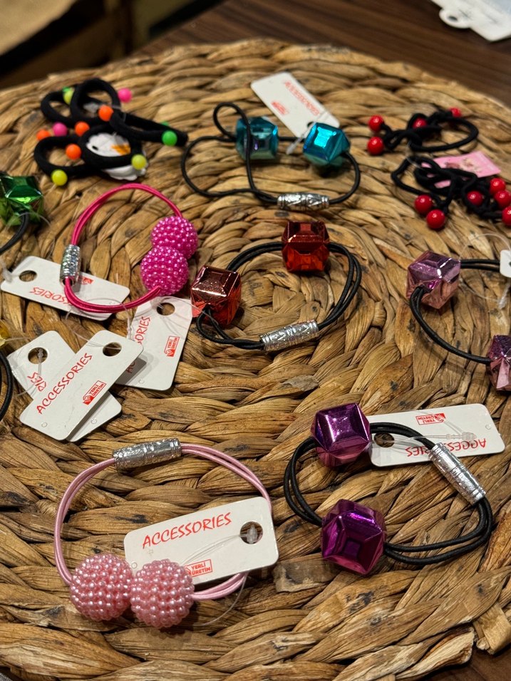 Etnik desenli, boncuklu renkli elastik çocuk saç tokaları. Bohem tarzına uygun, sağlam tutuş sağlar.