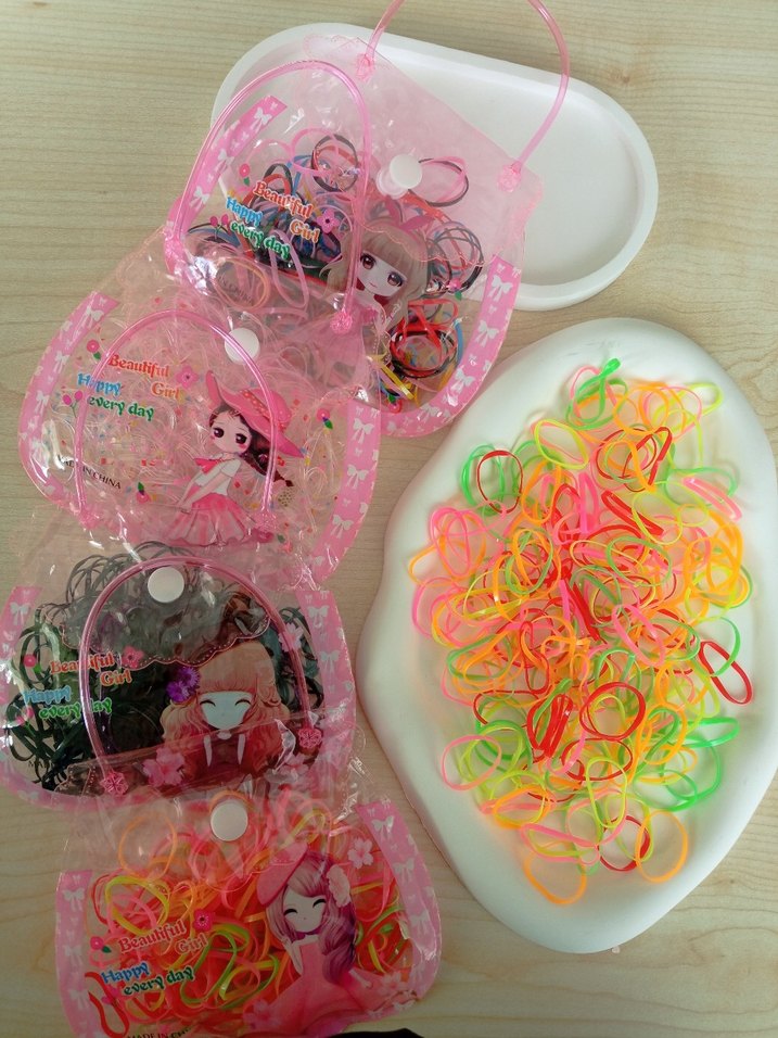 Çocuklar için renkli elastik saç tokaları. Bohem ve retro tarzda, desen içermeyen çok renkli tokalar şeffaf sevimli poşetlerde saklanır.