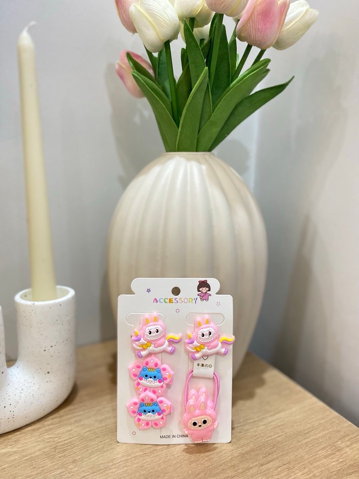 Renkli elastik saç tokaları, punk tarzı desenlerle çocuklar için. Eğlenceli pembe figürler ve şekiller içerir.