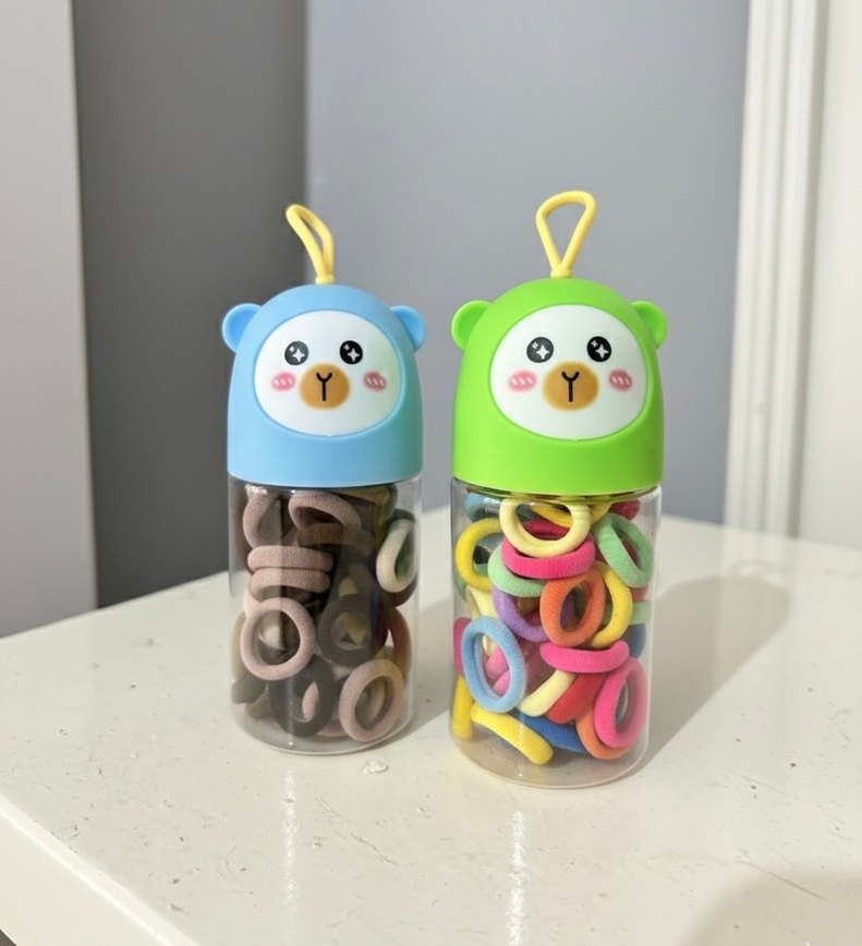 Çocuklar için renkli elastik saç tokaları, bohem tarzda baskılı desenlere sahip. Ayı figürlü kutularda taşıması kolay.