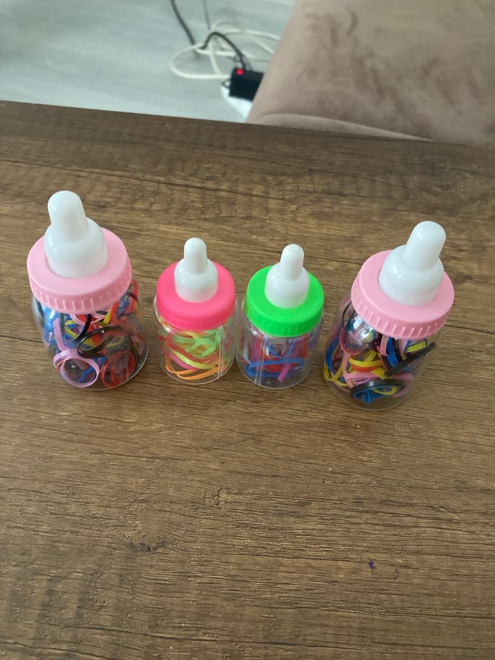Renkli elastik çocuk saç tokaları, küçük biberon şeklinde kaplarda saklanır. Saçları düzenli tutmak için uygundur. 4 adettir