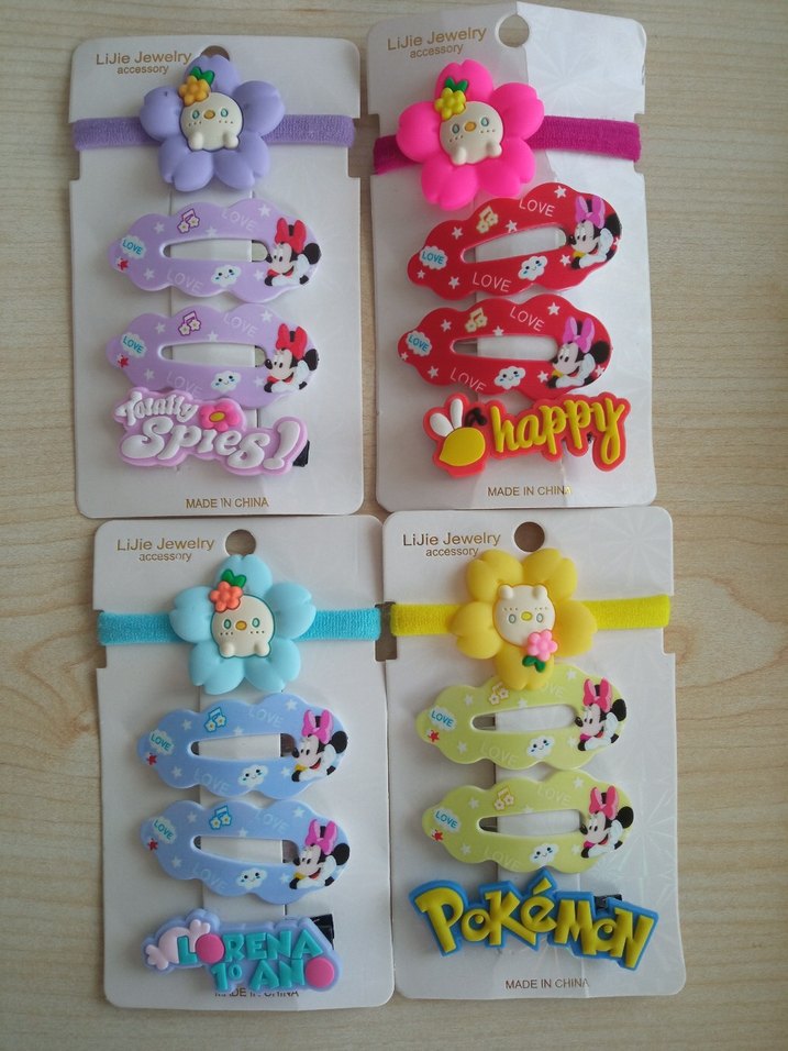 Renkli baskılı desenlere sahip elastik çocuk saç tokaları ve bantları, neşeli karakterler ve yazılar içerir.