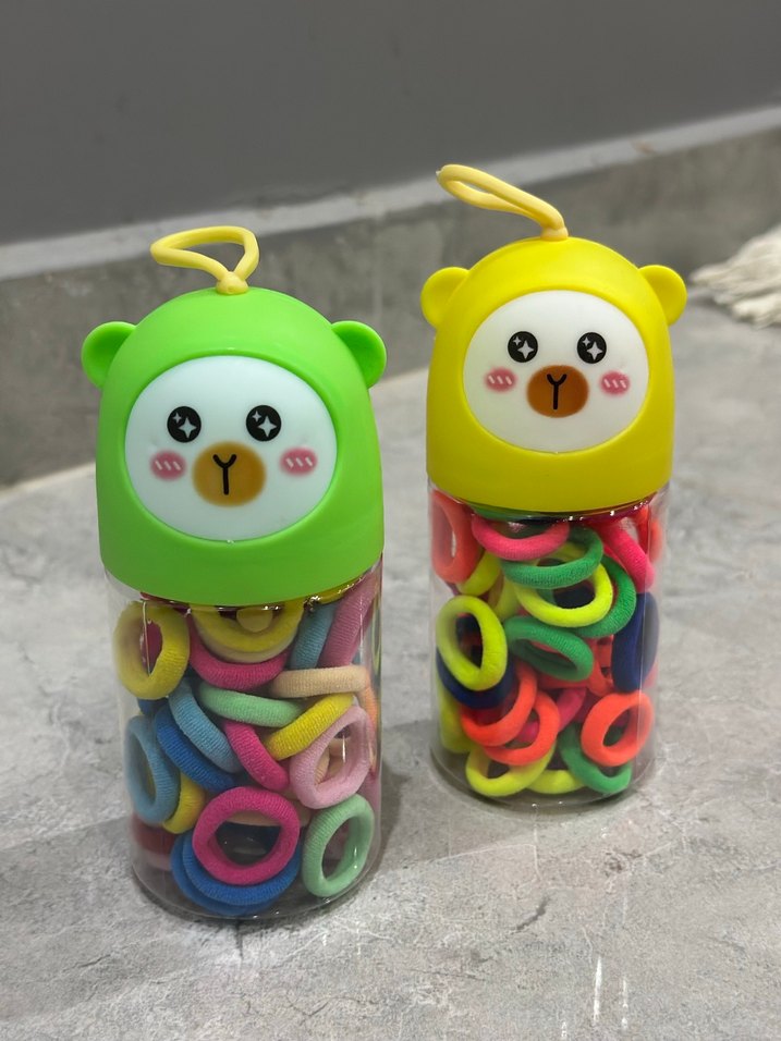 Sevimli baskılı yüzlere sahip ayı şeklinde kaplarda renkli elastik çocuk saç tokaları seti.