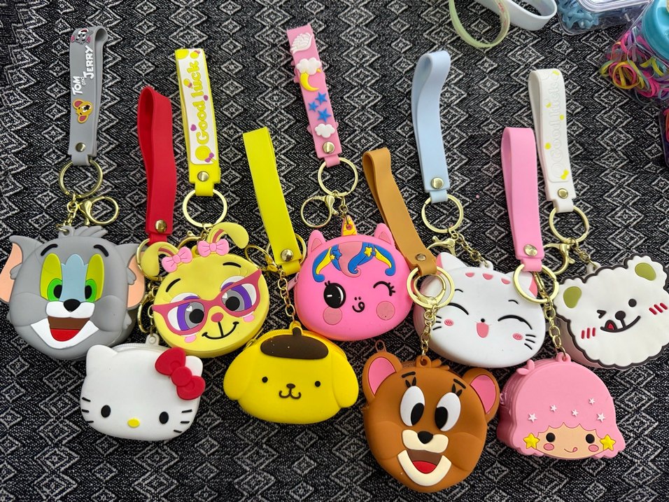 Renkli elastik bantlı, pop kültür temalı kadın anahtarlıkları. Her biri benzersiz çizgi film karakteri yüzü ve canlı renkte bant içerir. ️10 tane cüzdan anahtarlık fiyatıdır görseldekilern hepsini tek fiyata toptan almak isteyene beyaz kediliden iki adet var
