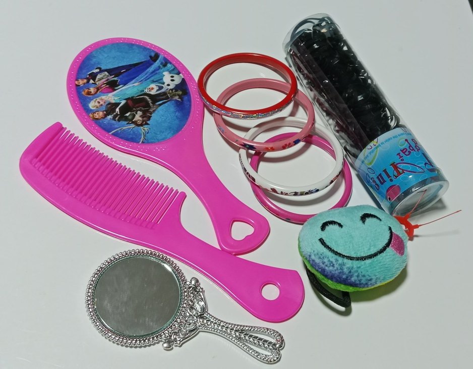 Renkli elastik saç bantları, pembe tarak ve küçük ayna içeren, eğlenceli ve retro tarz için uygun saç aksesuarları seti. 4 adet bilezik.. hepsinin fiyatıdır..
