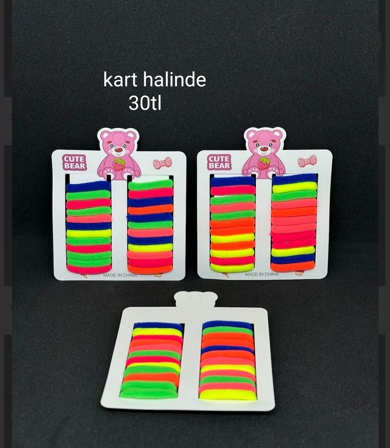 Renkli ve elastik çocuk saç bantları, baskılı desenli, kart halinde 30 TL. Günlük kullanım için uygun.