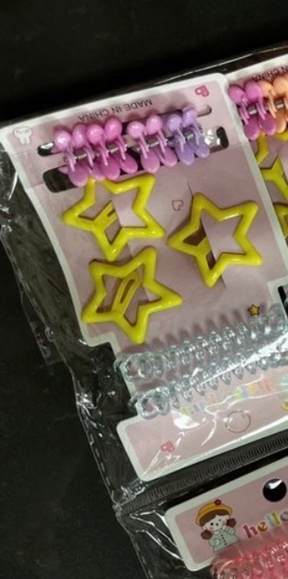 Renkli elastik saç tokaları ve bantlar, yıldız şeklinde ve baskılı desenlere sahip. Canlı renkleriyle çocuklar için trend ve şık.⭐ Tek paketi