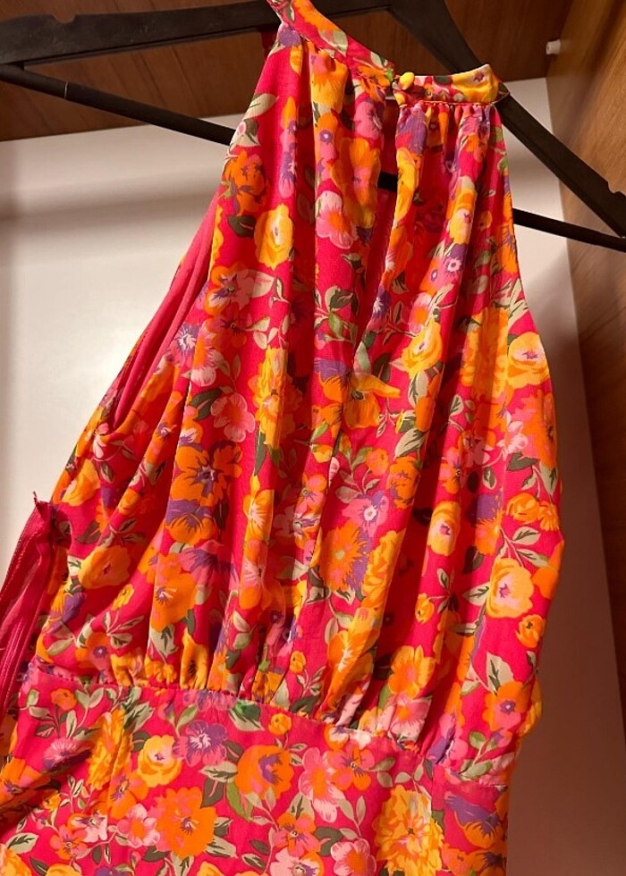 Halter yaka renkli şifon detayları olan elbise hem günlük kullanım için uygun hem de düğünler için uygun ben hem arkadaşımın düğününde hem de yazın günlük giyindim. İki kez kullandığım için satıyorum