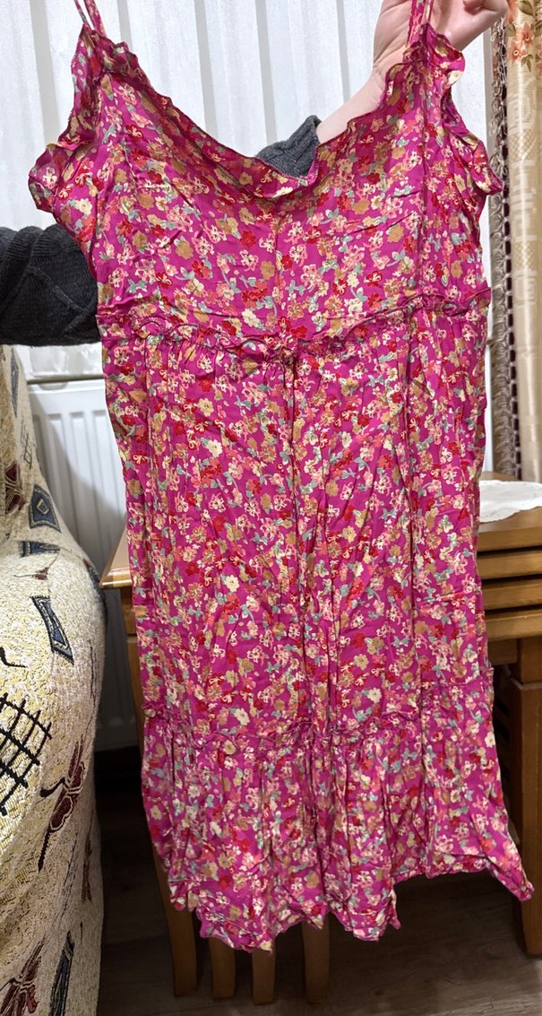 Renkli bağcıklı elbise, salaş kesim, straplez yaka ve kolsuz tasarıma sahiptir. Uzun boyda, tie-dye desendir.