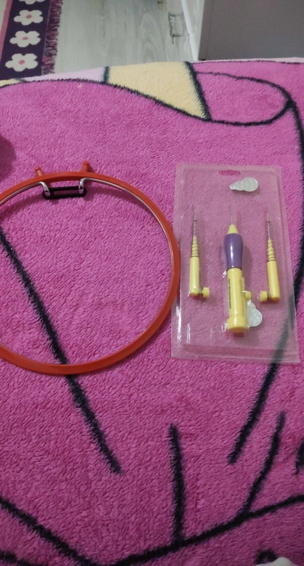 Pembe renkli yuvarlak halka ve küçük sarı-mor panc va nakış kasnak araçları içeren renkli aksesuar seti.