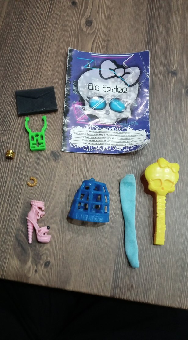 Renkli Elle Eedee aksesuar seti, mavi kafes, pembe ayakkabı, sarı anahtar ve diğer küçük parçaları içerir. Paketinde Elle Eedee logosu yer alır.