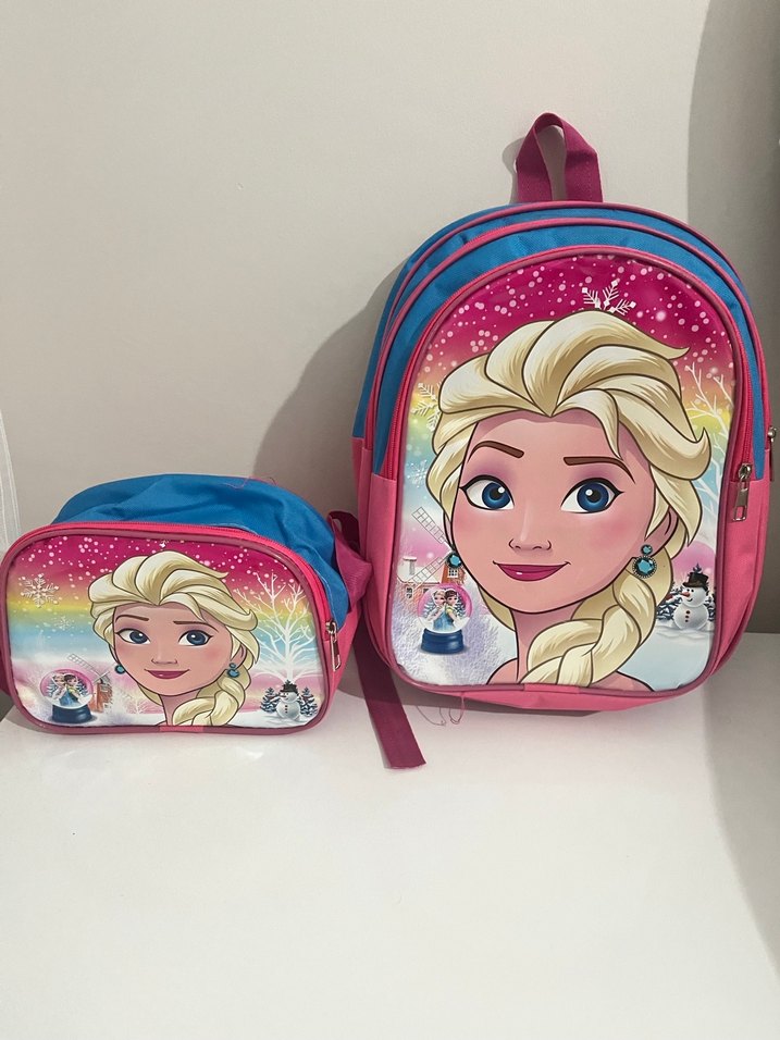 Çok renkli Elsa temalı çocuk okul çantası, ayarlanabilir askılar ve birden fazla bölme içerir. Uyumlu beslenme çantadı dahildir.