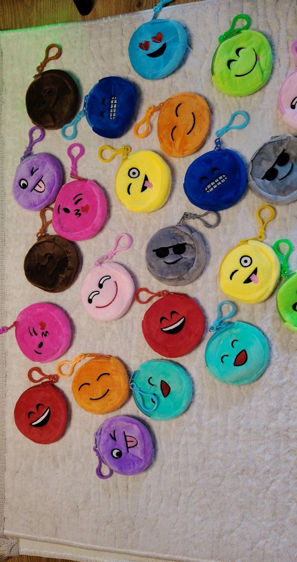 Çeşitli renk ve ifadelerde, anahtarlık klipsli renkli emoji desenli küçük yuvarlak çantalar. Küçük eşyalar için uygundur.