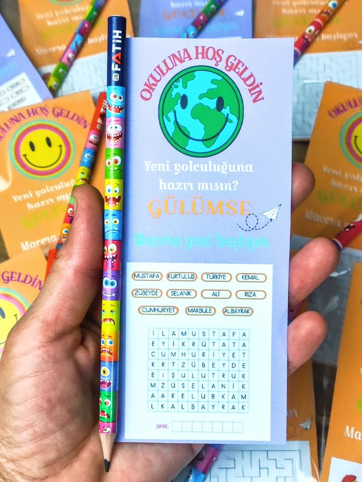 Renkli emoji kalem yeni okul yolculuğuna hoş geldin mesajı ve emoji desenli kalem bulunur. İsimler ve kelimeler içeren bulmaca da mevcuttur. 1 adet fiyatıdır en az alım 5 adettir ✏️