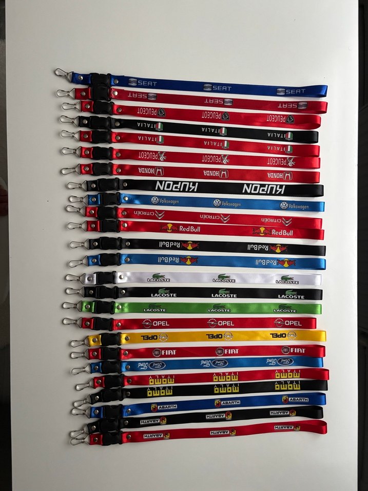 Çeşitli marka logoları taşıyan renkli erkek askıları. Metal klipslerle sabitlenir, canlı renklere sahiptir.