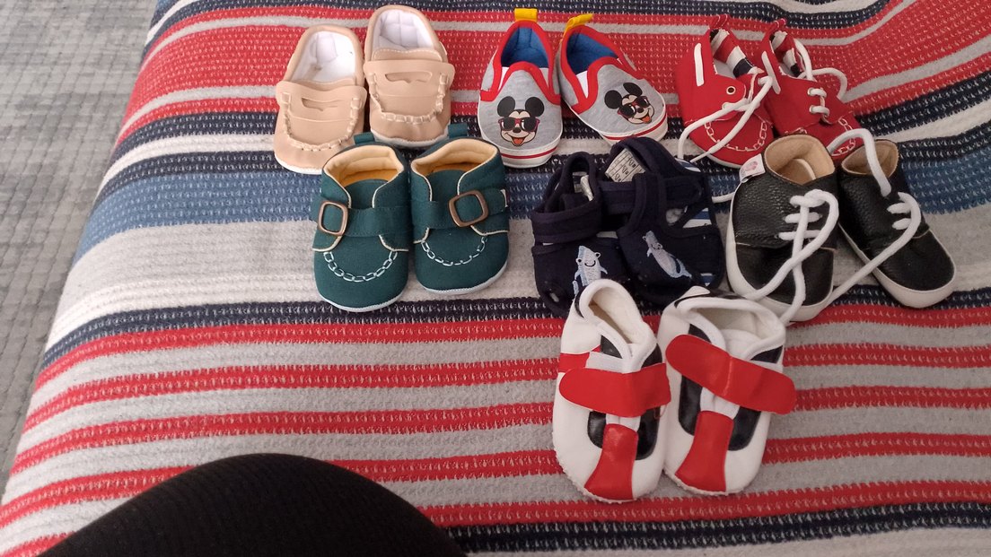 Renkli, lastikli tabanlı erkek bebek ilk adım ayakkabıları nakışlı desenlere ve kolay giyilen Velcro bantlara sahiptir.