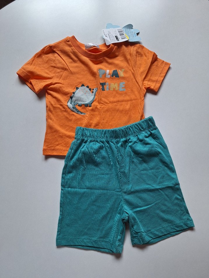 Renkli kısa kollu turuncu üst ve mavi şortlu, yumuşak ve sıcak kumaştan erkek bebek takımı. Üstte 'PLAY TIME' yazısı ve sevimli baskı bulunur.