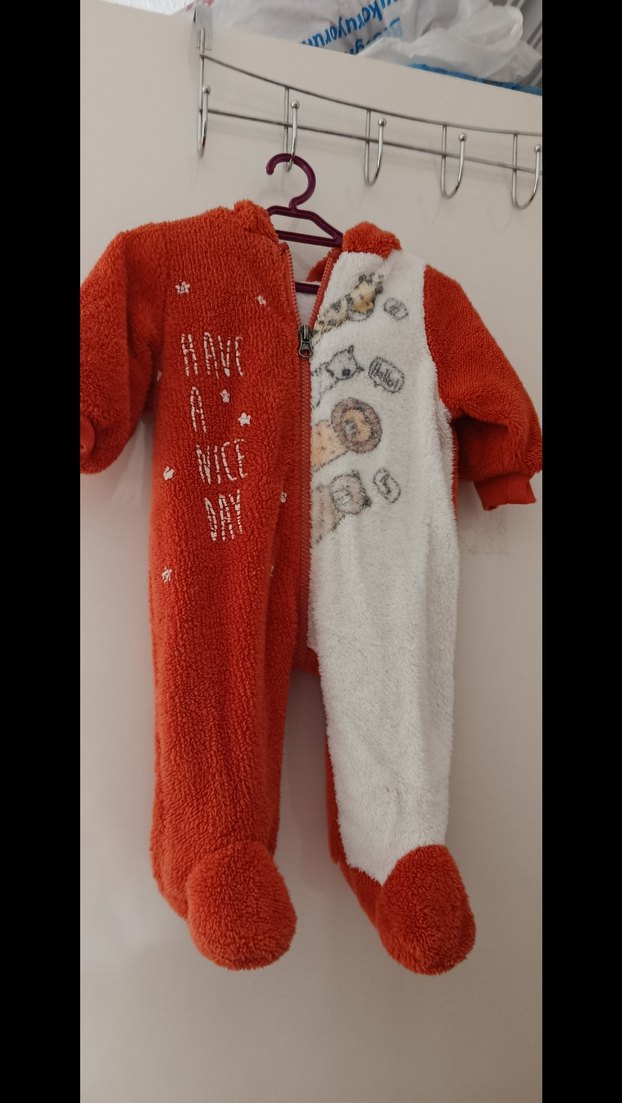 Örgü, yumuşak ve sıcak kumaştan yapılmış, renkli baskılı desenli erkek bebek tulumu. Fermuarlı ve ayaklı, tam koruma sağlar. Canlı kırmızı ve beyaz renklerle sokak stili.