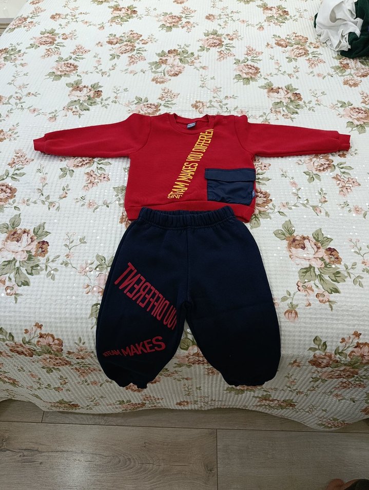 Kırmızı uzun kollu, bisiklet yaka ve cırt cırt detaylı sweatshirt ile lacivert renkli baskılı pantolon içeren renkli bebek erkek takımı. Yumuşak ve sıcak kumaştan, sokak stiline uygun.