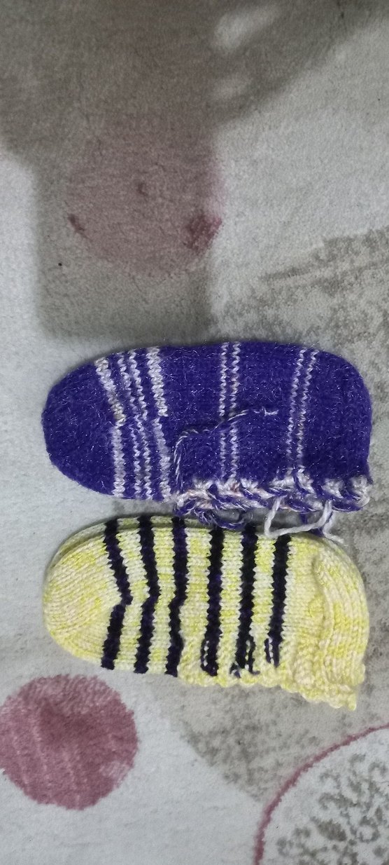 Mor ve sarı çizgili bağlama desenli renkli erkek çocuk çorapları. Yumuşak ve rahat örme kumaş.