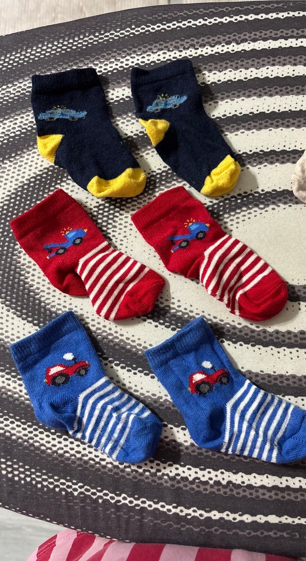Nakışlı araba desenli, çeşitli renklerde çizgili desenli renkli erkek çocuk çorapları. Yumuşak ve rahat kumaştan üretilmiştir. 1. Bir kere giyildi 2 ve 3.çorap hiç kullanılmadı