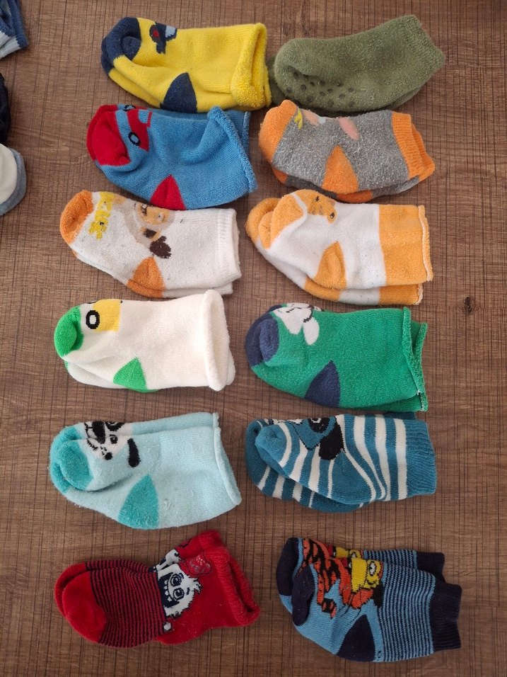 Çeşitli eğlenceli desenlere sahip, yumuşak kumaştan yapılmış renkli erkek çocuk çorapları seti.