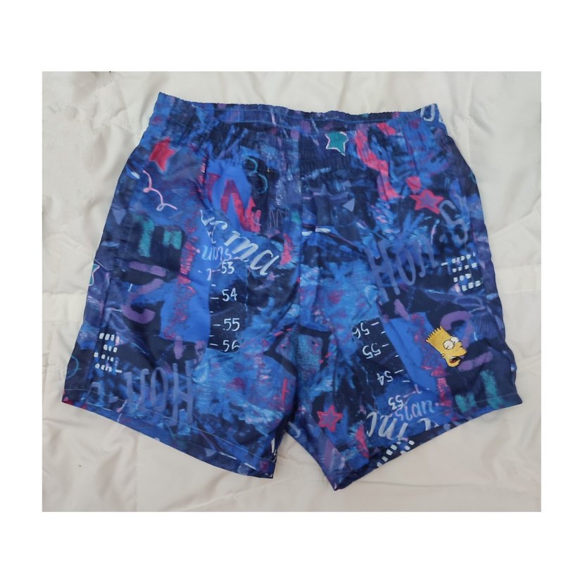 Erkek çocuk mayo. Lacivert, pembe, beyaz çok renkli-desenli, detaylı, bol kesim erkek mini deniz şortu. Plajda kullanıma uygun rahat tasarım. Kusursuz. Hiç kullanılmadı. Çift cepli, file astarlı. Simpson armalı. Giyilmemiş durumda bel 31 cm. Besen 39 cm. Uzunluk 34 cm.