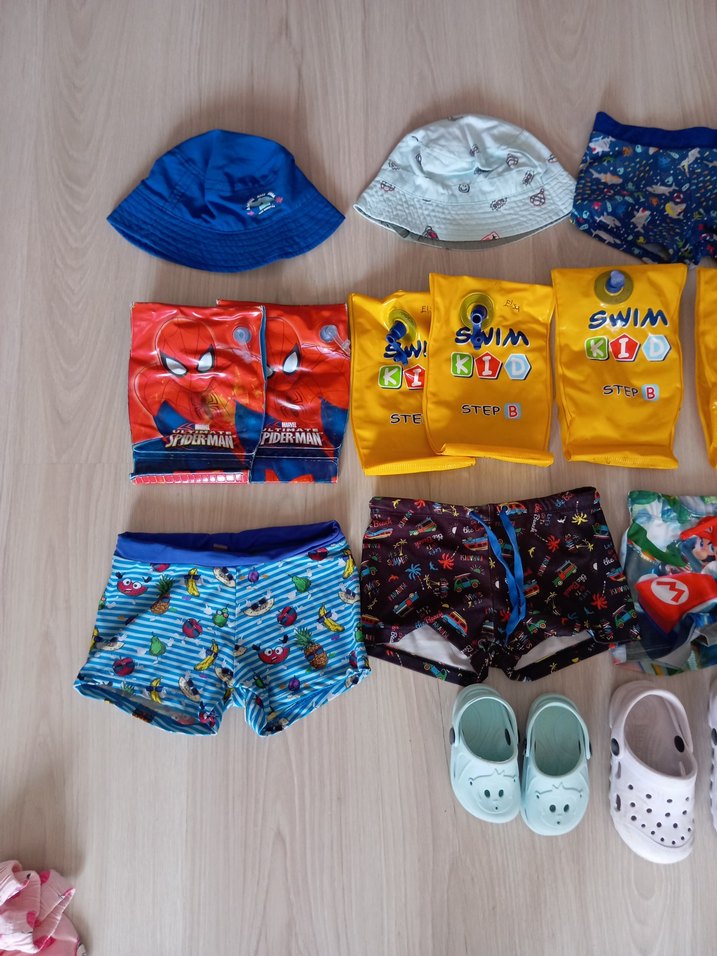 Renkli baskılı erkek çocuk deniz şortları, şişme kolluklar üzerinde 'SWIM KID' yazısı ve iki şapka içerir. Canlı desenler ve kısa kollu mayo seti. deniz şortu 1cift kolluk ve şapka takım olarak yazan fiyattir