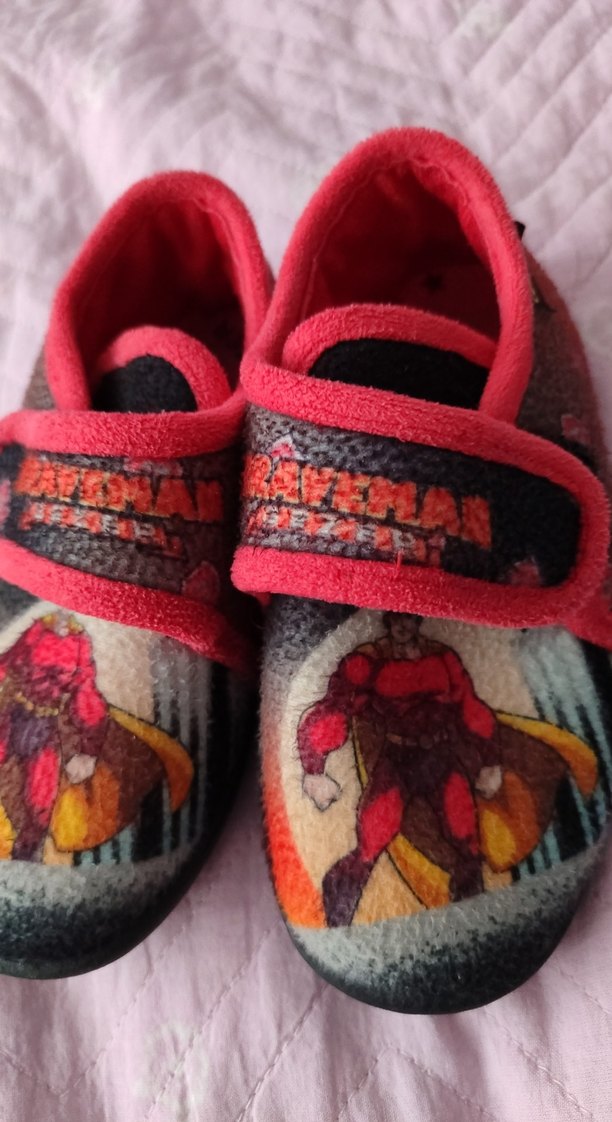 Renkli baskılı erkek çocuk terliği, yumuşak ve sıcak kumaş, kolay kullanım için Velcro bantlı. Kırmızı detaylar şıklık katıyor.