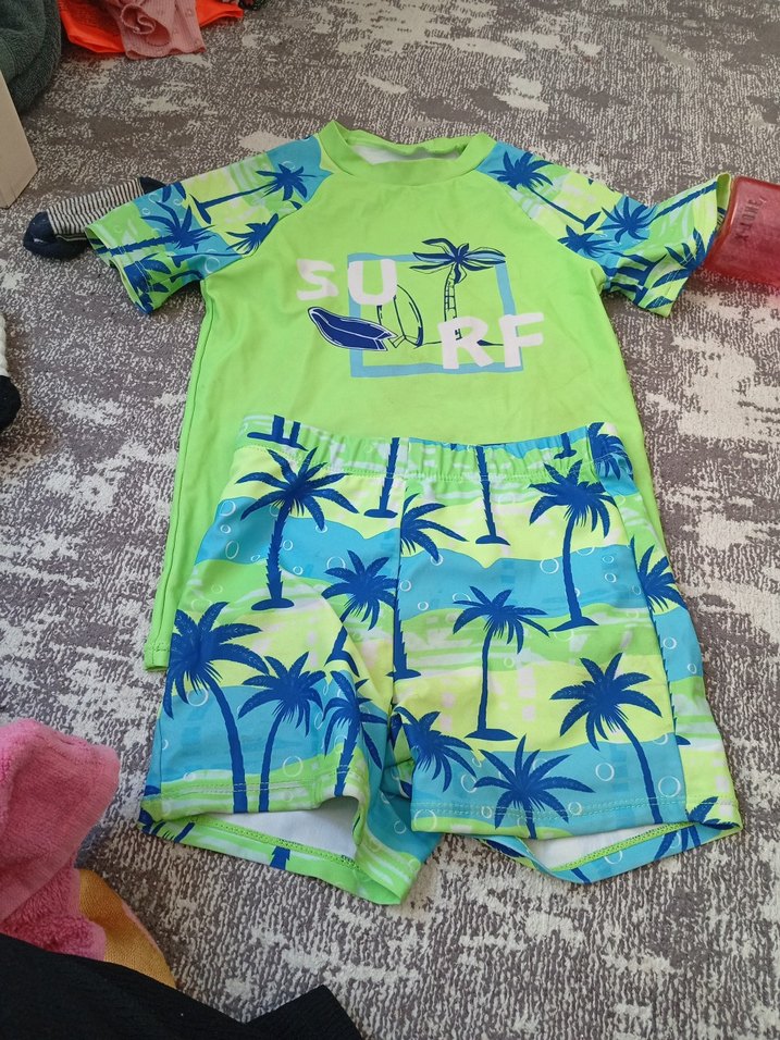 Renkli erkek çocuk mayo takımı, kısa kollu üstünde surf baskısı ve palmiye desenli şortlarla tamamlanmıştır.