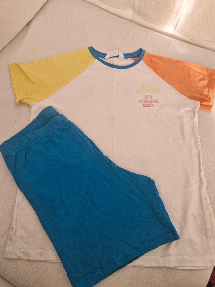 Erkek çocuk pijama takımı, kısa kollu ve bisiklet yaka, pastel sarı ve turuncu kollu, baskılı üst ve mavi şortlu, rahat kesim ve gündelik tarz sunar.