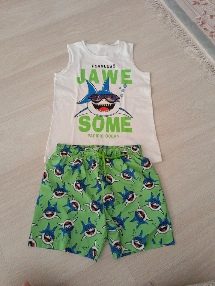 Kolsuz beyaz üstte renkli köpekbalığı baskısı ve yeşil, çoklu köpekbalığı desenli şort bulunan erkek çocuk mayo takımı. 9-10 yaş bedenli.