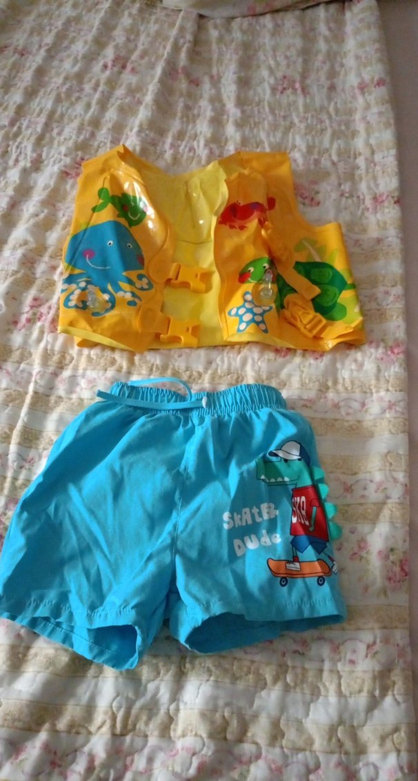 Kolsuz, renkli can yeleği ve mavi, kaykaycı desenli, bağcıklı erkek çocuk şortu. Şortta "SKAtE" yazısı bulunur. hiçbir sorunu yoktur kullanmadık bile doğru düzgün erkek mayın şort yeniden farksız dir 1 kere giyildi. indirim yapamıyorum zaten teklif alimda bile daha fazla tutuyor.