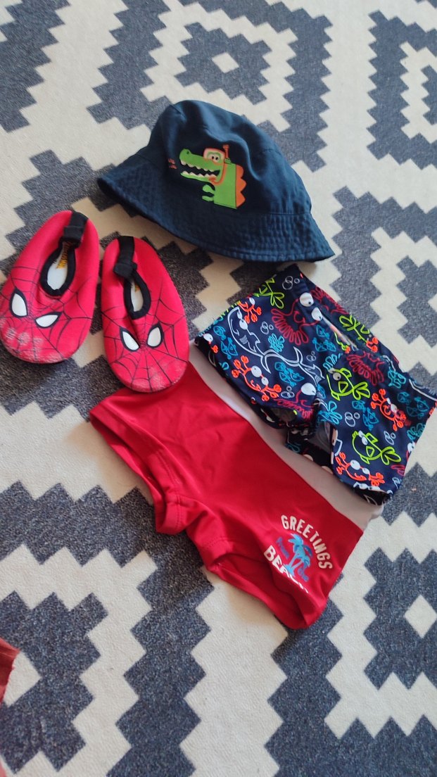 Renkli Erkek Çocuk Mayo ve Deniz Şortu deniz ayakkabıaı ve şapka