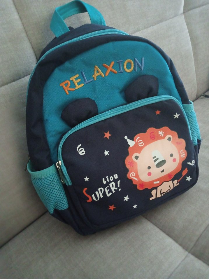Renkli çocuk okul çantası, aslan desenli ön cep ve yan file cepler içerir. Üstte kulp ve eğlenceli nakış detayları bulunur.