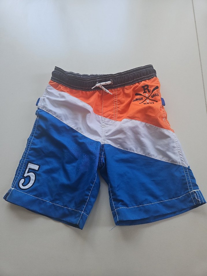 Mavi, beyaz ve turuncu renkli bağlama desenli erkek çocuk şortu. Lastikli bel ve bağcık detaylı, paçada 5 numara baskısı bulunur. 5 6 yastir