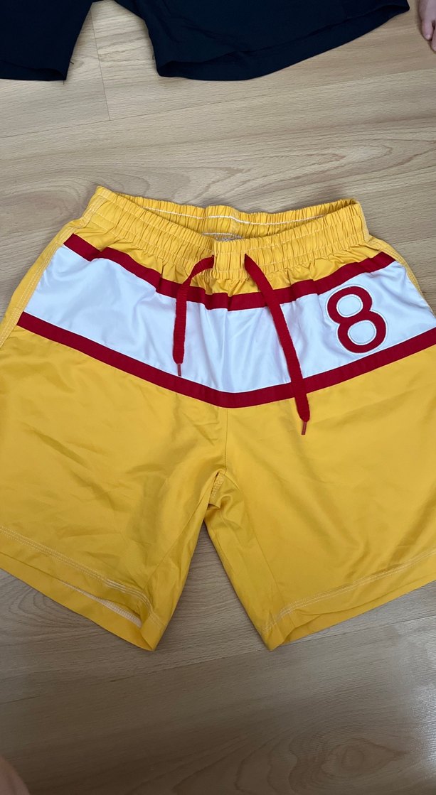 Renkli baskılı desenli, bel kemerli, bol kesim sarı erkek mini yüzme şortu, plaj için uygundur.