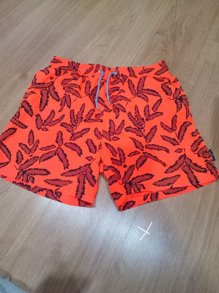 Renkli, bol kesim ve pile detaylı erkek mini yüzme şortu. Canlı kırmızı tie-dye desenli, plaj ve günlük sokak giyimi için uygun.