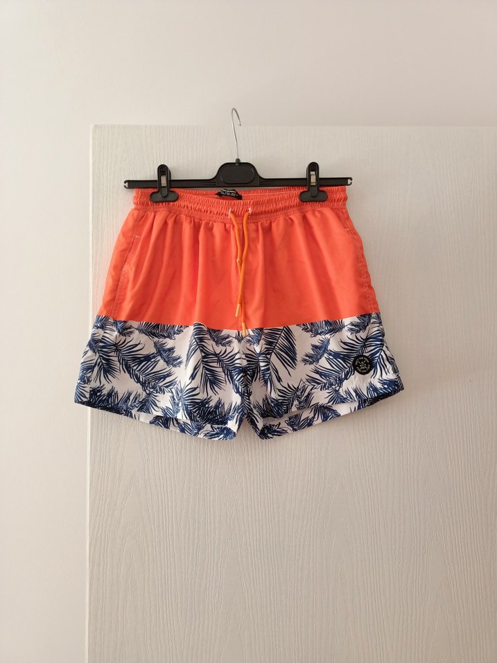Rahat kesim, canlı turuncu üst kısmı ve tropikal desenli alt kısmı olan, erkek şort mayo.