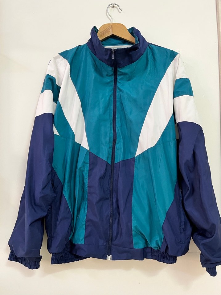 Renkli erkek spor rüzgarlık, yüksek yakalı, uzun kollu ve fermuarlı. Sentetik kumaştan, bol kesim ve midi boyda, sokak modasına uygun.