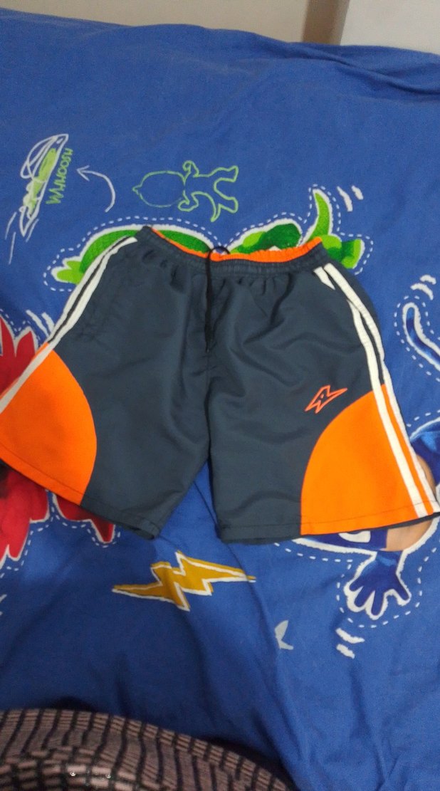 Renkli sentetik kumaştan, bol kesim erkek spor şortu, Velcro bantlı ve baskılı detaylara sahip.