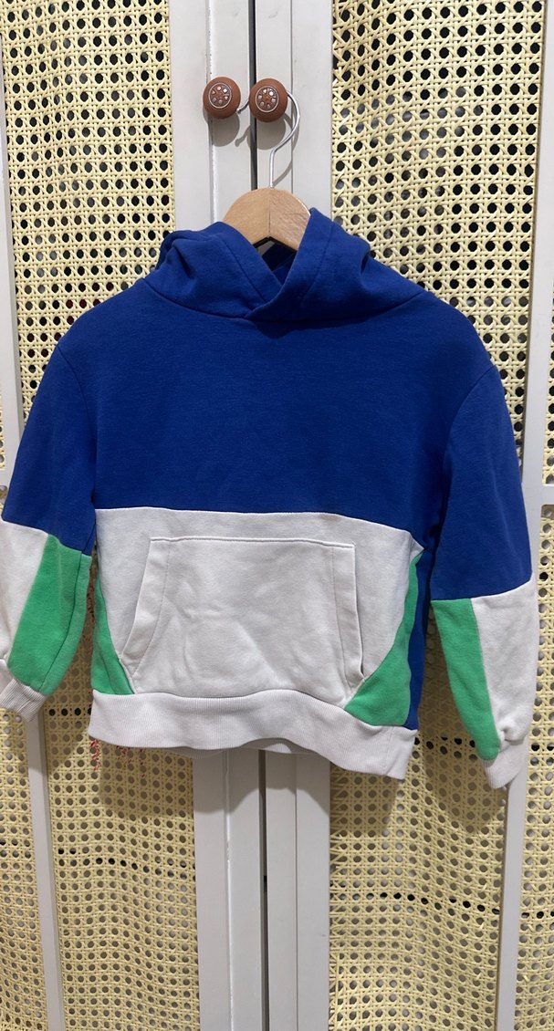 (2-4 yaş )Renkli, kapüşonlu erkek sweatshirt, uzun kollu ve bol kesimdir. Mavi, beyaz ve yeşil renklerle velcro detayına sahiptir. Yumuşak ve sıcak kumaştan imal edilmiştir. Son görselde küçük bir lekesi var kimyasal ürün kullanmadığım icin. leke cıkarıcılarla cıkabilir.