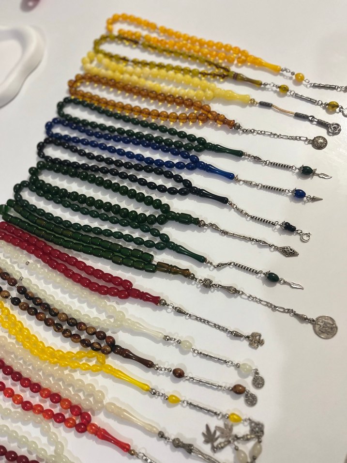 Çeşitli canlı renklerde, bohem tarzda klasik erkek tesbihler. Her birinde detaylı metal süslemeler ve farklı boncuklar bulunur. Tek fiyatıdır toplu alımda indirim mevcuttur