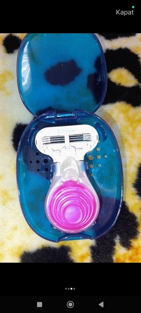 Mavi kutuda pembe saplı renkli erkek tıraş makinesi ve yedek bıçaklar. Kompakt ve taşınabilir.
