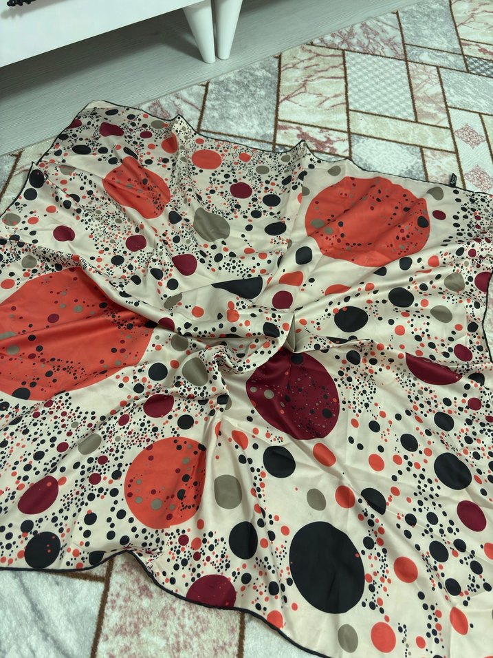 Kadınlar için çok renkli puantiyeli, dantel detaylı sentetik kumaştan yapılmış fular. Bohem ve retro tarzlara uygun koyu canlı renkler içerir.