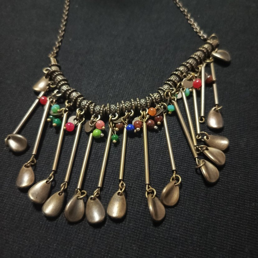 Bohem tarzda, renkli boncuklar ve etnik desenlerle detaylandırılmış uzun zincir kolye, günlük kullanım için uygundur.