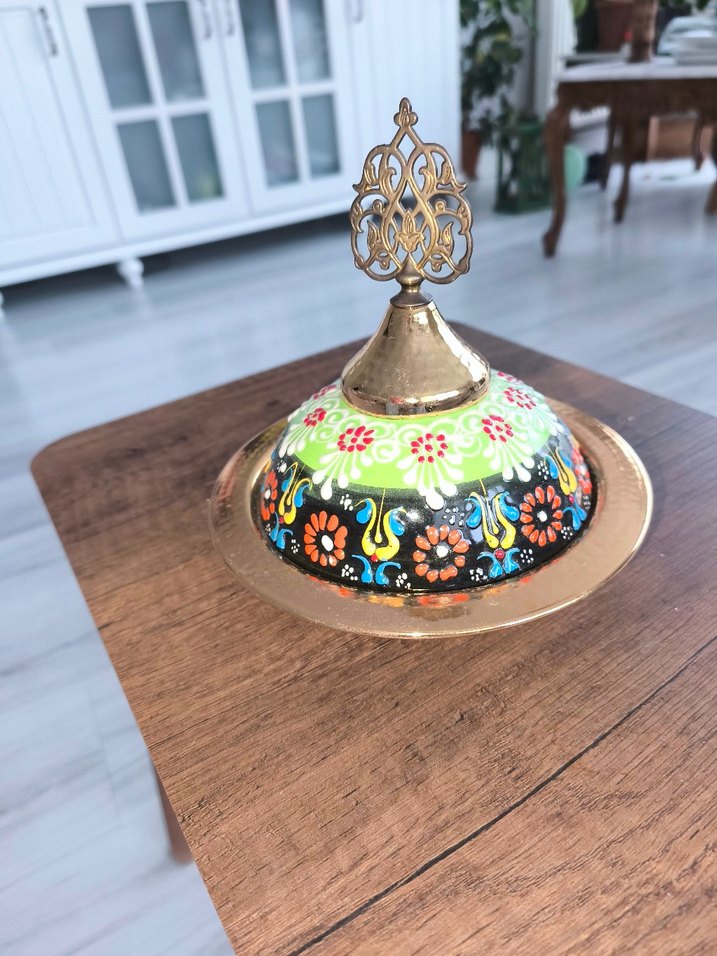 Renkli etnik desenlere sahip, bakır, kapaklı ve detaylı saplı geleneksel tarzda bir sunum tabak. ️ üründe deformasyon mevcut,fiyata yansıttım. marka temsilidir tabak çapı 16 cm