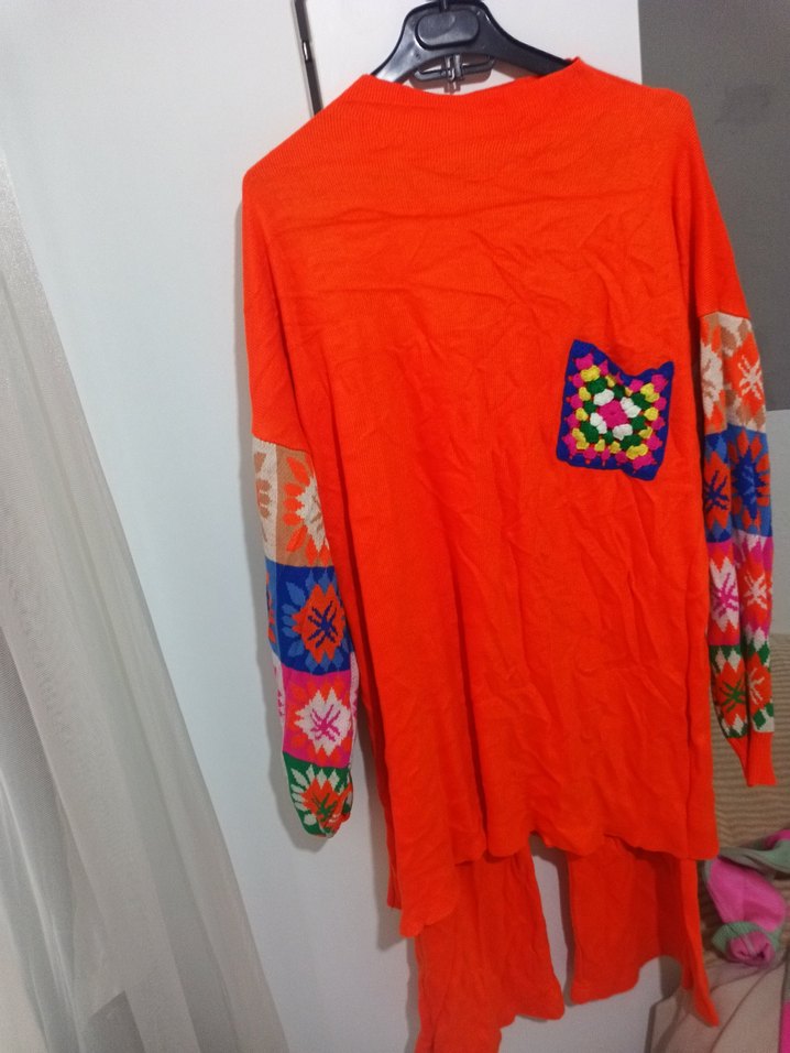 Renkli etnik desenlere sahip bohem uzun kollu, bol kesim ve uzun boy kadın tunik. Örme yakalı cepli, günlük kullanım için uygundur.