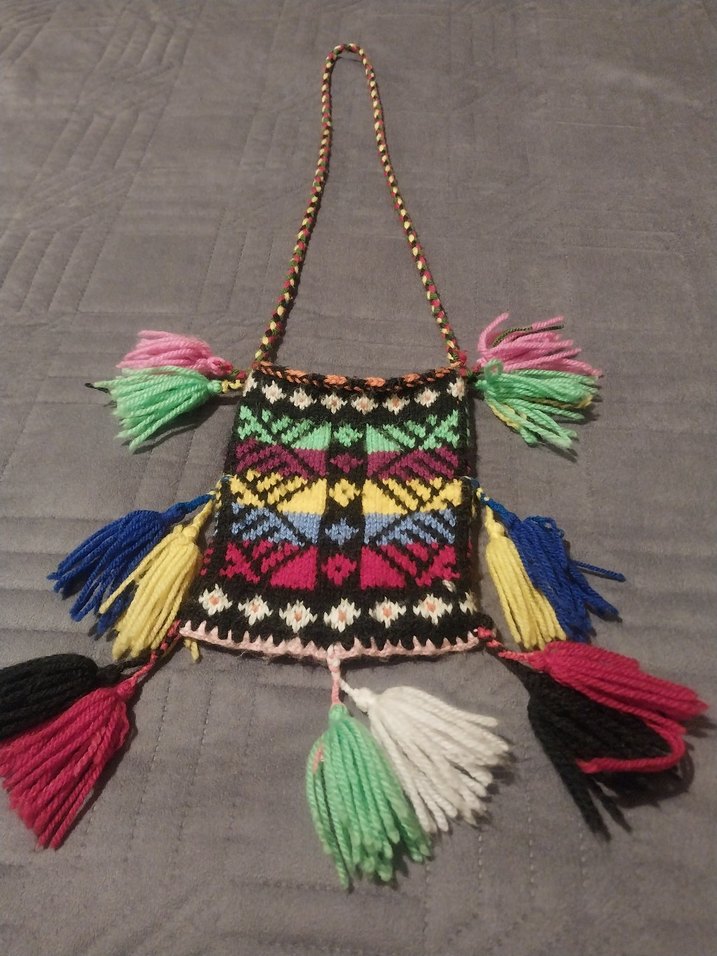 Etnik desenli, püsküllü renkli örgü kadın çantası. Bohem tarzında, örgülü askılı günlük kullanıma uygun. boy 18 en 14cm sap toplam boy 80cm şark köşelerine çok yakışan bir ürün günlük kullanıma da uygun astarsız