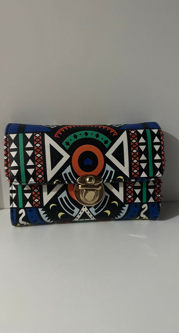 Canlı renklerde etnik desenli, tokalı, sentetik kumaştan yapılmış kadın clutch çanta. Bohem ve retro tarzlar için uygundur. Kesın alıcı yazsın..